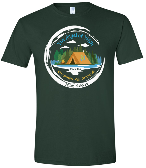 Celebrate the festival of Sukkot with this meaningful t-shirt featuring the powerful message from Psalm 34:7: The Angel of YHVH encamps all around.